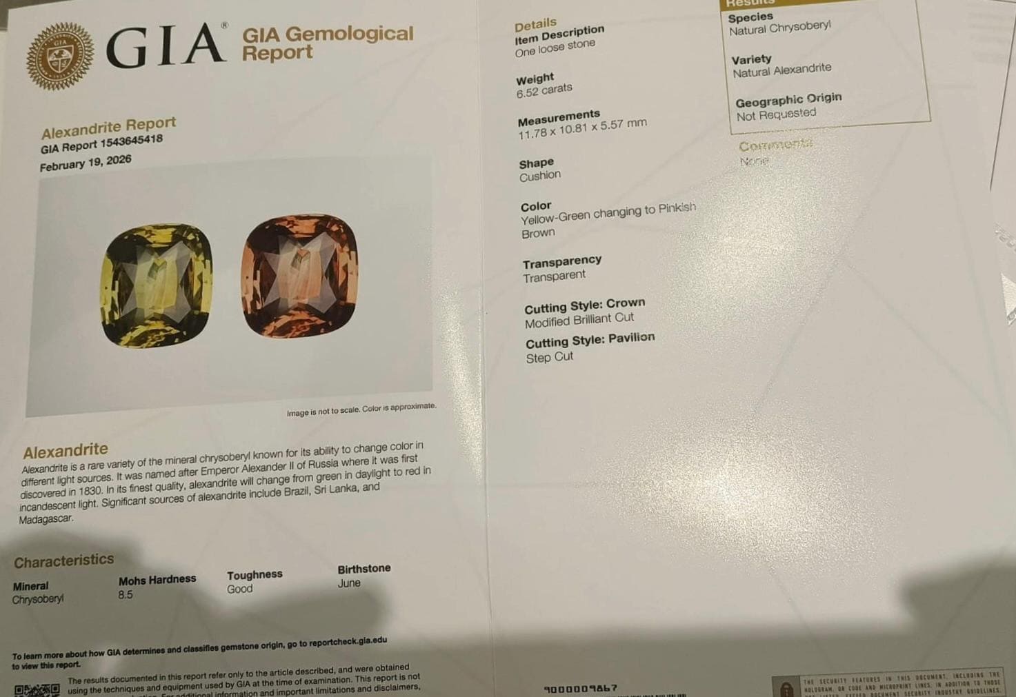 6.52 Carat Natural Alexandrite – GIA Certified Color-Change Gemstone